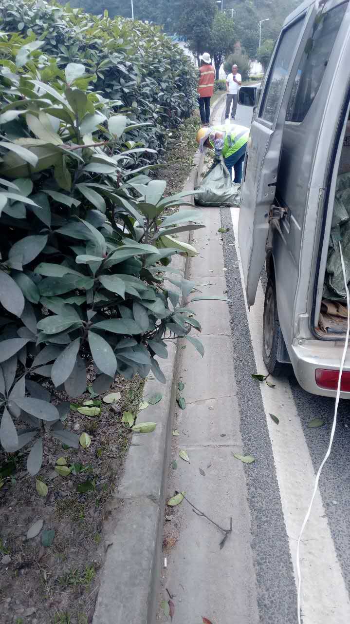南二環(huán)中央綠化帶修枝剪葉綠化環(huán)境維護工作正在進行中,圖為金海綠化養(yǎng)護隊工作中。